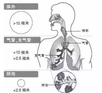 PM2.5是可以到達肺泡的。PM2.5以下的細顆粒物,上呼吸道擋不住,它們可以順利下行,進入細支氣管、肺泡。我們的呼吸系統像植物的根系,自上而下,氣管分出支氣管,支氣管分出密密麻麻的細支氣管,密密麻麻的細支氣管又連著密密麻麻的肺泡,肺泡的數量有三四億個。吸進去的氧氣進入肺泡,再通過肺泡的壁進入毛細血管,再進入整個血液循環系統。我們吸進去的PM2.5,因為太小,也能進入肺泡,再通過肺泡的壁進入毛細血管,進而進入整個血液循環系統。