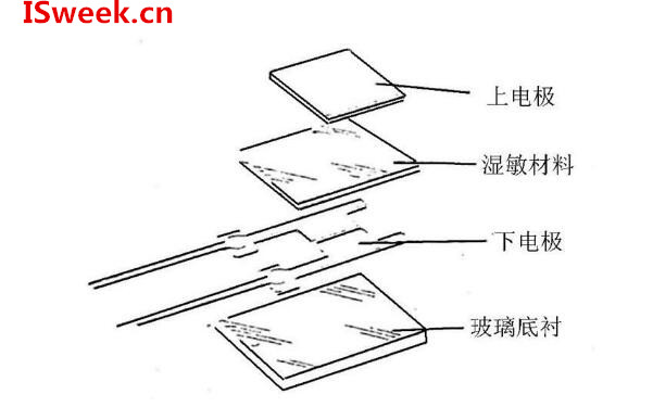 傳感器主要由濕敏電容和轉換電路兩部分組成。濕敏電容的結構見上圖所示。它由珹璃底襯、下電極、濕敏材料、上電極幾部分組成。兩個下電極與濕敏材料,上電極構成的兩個電謇成串聯連接。濕敏材料是一種高分子聚合物,它的介電常數隨著環境的相對濕度變化而變化。當環境濕度發生變化時,濕敏元件的電量隨之發生改變,即當相對濕度增大時,濕敏電容量隨之增大,反之減小(電容量通常在48~56pf間)。傳感器的轉換電路把濕敏電容變化量轉換成電壓量變化,對應于相對濕度0~10%‰RH的變化,傳感器的輸出呈0~1v的線性變化。