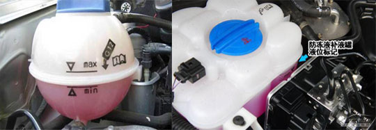 綜上所述發(fā)動(dòng)機(jī)冷卻液的液位檢查是通過儲(chǔ)液罐液位進(jìn)行檢查的。冷卻液儲(chǔ)液罐位于車輛左側(cè)(面對(duì)車輛),其外形為球狀,近似透明的塑料材質(zhì),其上蓋為藍(lán)色。原車內(nèi)裝的冷卻液為粉紅色。在該車發(fā)動(dòng)機(jī)冷卻液液罐上,設(shè)有冷卻液的上下限,冷卻液液位應(yīng)位于上下限之間(一般在檢查冷卻液液位時(shí)應(yīng)在冷車狀態(tài)進(jìn)行)。