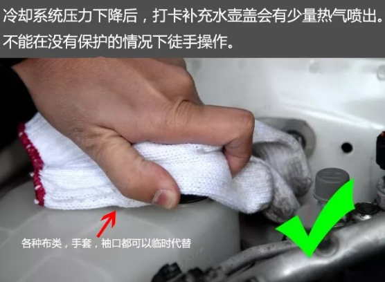 停機(jī)狀態(tài)待電子風(fēng)扇停轉(zhuǎn)后方可打開冷卻液補(bǔ)充水壺,將冷卻液補(bǔ)充至上限和下限刻度之間(發(fā)動(dòng)機(jī)溫度正常后冷卻液液面會(huì)上升,超過上限會(huì)對(duì)散熱不利)。冷卻液溫度高時(shí),冷卻液補(bǔ)水壺蓋絕對(duì)不能打開,簡(jiǎn)單的判斷方法是用手捏水箱上水管,如果上水管處于緊繃狀態(tài),此時(shí)水管內(nèi)處于高溫高壓狀態(tài),高溫冷卻液和高壓氣體會(huì)瞬間從壺蓋螺紋縫隙中噴出,非常危險(xiǎn)。 當(dāng)冷卻液達(dá)到正常工作溫度時(shí),正確補(bǔ)充冷卻液方法是先滅車,等待一會(huì)后上水管壓力會(huì)降低,在非之前的緊繃狀態(tài)后,用布或手套之類的東西墊在補(bǔ)充水壺蓋上,慢慢旋轉(zhuǎn)擰開,到有氣體噴出時(shí)停止旋轉(zhuǎn),帶到氣體完全釋放后就可以擰開壺蓋,補(bǔ)加冷卻液了。 ?如下圖: