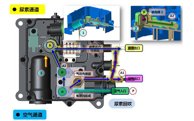 尿素泵工作時(shí),尿素首先經(jīng)過濾芯過濾掉雜質(zhì),以防堵塞管路和噴嘴,然后進(jìn)入尿素溶液泵,與壓縮空氣充分混合后一起噴出。尿素泵停止噴射以后壓縮空氣還要反向吹一段時(shí)間,將殘余尿素吹回罐內(nèi),防止尿素結(jié)晶阻塞管路。