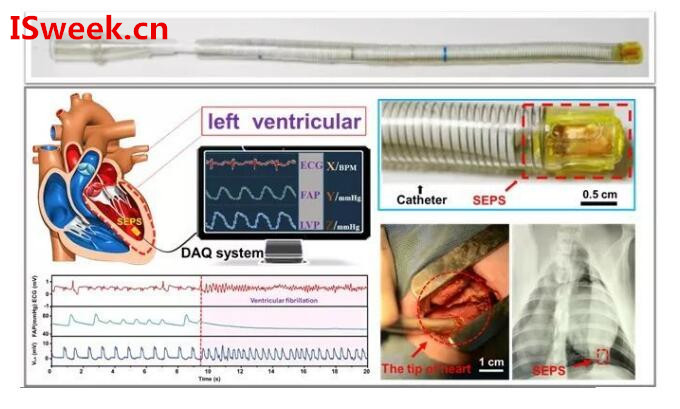 隨著研究的不斷深入,并且根據(jù)臨床監(jiān)測(cè)心內(nèi)壓的實(shí)際需求,李舟與其合作者繼續(xù)推進(jìn)微型化iTENG的研發(fā),研制出能夠通過(guò)微創(chuàng)手術(shù)進(jìn)入心腔內(nèi)實(shí)時(shí)監(jiān)測(cè)心內(nèi)壓的自驅(qū)動(dòng)心內(nèi)壓傳感器(SEPS)。在研究工作中,SEPS結(jié)合導(dǎo)管入心腔,需實(shí)現(xiàn)器件的微型化,微型化勢(shì)必使得器件輸出性能大打折扣。因此,要實(shí)現(xiàn)具有高輸出、超靈敏度的微型iTENG,器件本身的研制就是一個(gè)不小的挑戰(zhàn)。基于以上要求,在構(gòu)建SEPS器件的過(guò)程中,運(yùn)用高壓電暈放電極化聚合物摩擦層,使得尺寸微型化的SEPS(1 cm × 0.5 cm × 0.1 cm)的高輸出電壓達(dá)到6.2 V,比對(duì)照組高6倍。同時(shí),研究者通過(guò)血液相容性、長(zhǎng)效穩(wěn)定性等實(shí)驗(yàn),證明SEPS有良好的生物安全性,具有長(zhǎng)期植入體內(nèi)工作的能力。此外,體外模擬實(shí)驗(yàn)表明該器件對(duì)于壓力變化有著高靈敏度 (1.195 mV/mmHg) 和優(yōu)異的線性度(R2=0.997)。