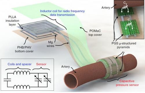 斯坦福大學(Stanford University)研究團隊研發出生物可分解的血流傳感器,可以趁血管手術時包裹住動脈,以監控術后的血流情況,讓醫生知道血管有沒有堵塞,以免爆發嚴重的并發癥。由于這款傳感器是生物可分解的,久而久之會自動分解消失,不用特地動手術移除。