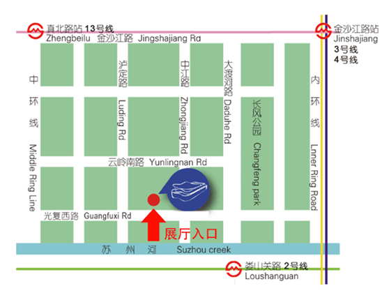 展廳入口:1樓展廳南入口(上海市普陀區光復西路2739號,近中江路)