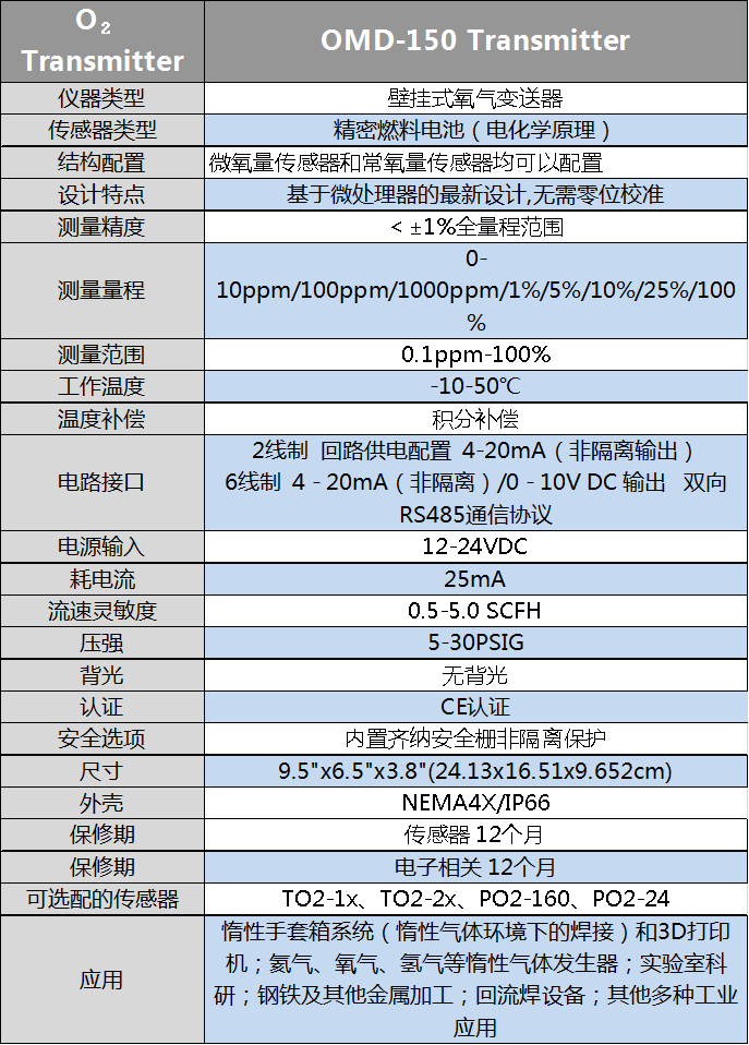 OMD-150是一個新型的、獲得CE認證的、基于微處理的氧氣變送器。該變送器能夠根據具體的應用需求配置成微量氧或者常量氧檢測。這對煉鋼是非常重要的,因為煉鋼需要全氧或者微量氧同時監測,它是可完全配置的,從而還能滿足其他絕大部分微量氧和常亮氧分析的工業應用需求。該分析儀配有專用的世偉洛克管配件,一種是1/8英寸的,另一種是1/4英寸的,還有6mm的,緊湊的結構使傳感器的壽命更長。各種可選的電氣接口方式、不同量程的傳感器以及氣路連接方式,使得該變送器成為一個經濟且維護成本低的解決方案。具體參數特點如下: