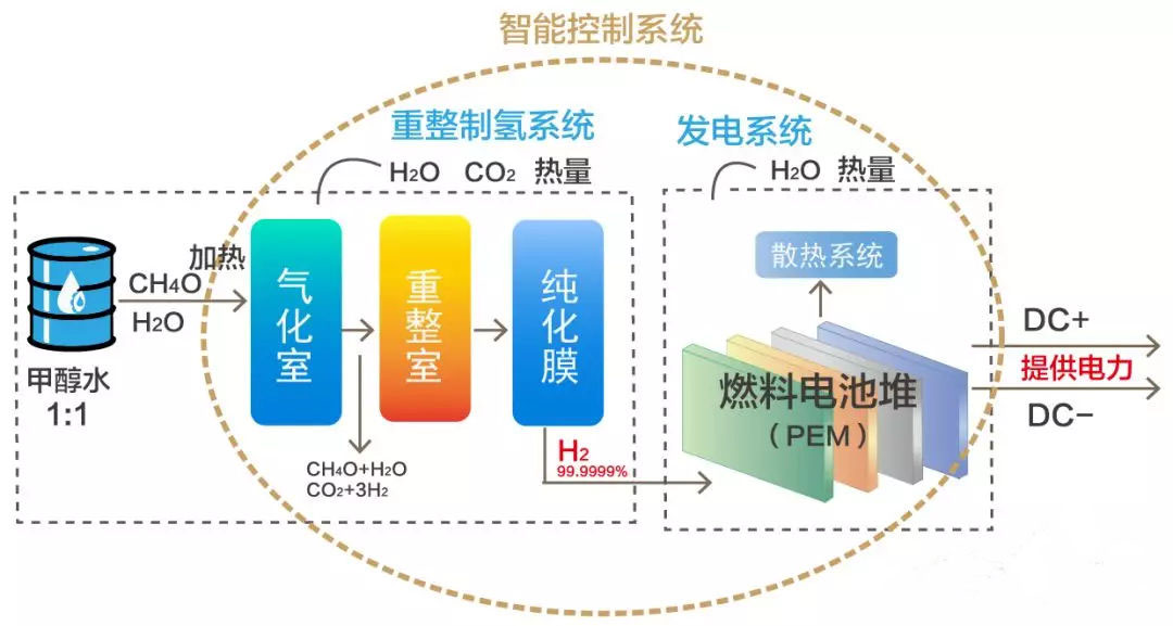 談及“甲醇重整制氫燃料電池”技術現在的應用場景可謂比較廣泛例如:公交車、物流車、大巴車、冷鏈物流車等交通領域都有它的身影。下面了解一下甲醇重整制氫燃料電池技術的工藝流程及熱電聯供系統。