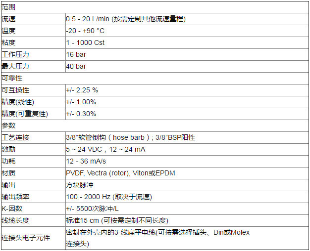 該流量計是一款性價比出眾的通用型流量計,它的工作溫度范圍為-20~+ 90°C,工作壓力是16 bar(zui大40 bar),流速量程為每分鐘0.5~20升。它用途廣泛,適用于多種應用和流體。在材質方面SF800整機均由化學和熱恢復力優秀的高品質塑料和復合材料制成。外殼材質是PVDF(一種高級PVC)制成,而內部轉子僅重0.04克,由一種重量極輕的液晶聚合物Vectra制成。 兩種材料都不易受水垢影響。集成PCB發出紅外信號,該信號被轉子的三個葉片中斷。SMD元件將中斷的信號轉換為脈沖。SwissFlow流量傳感器的轉子殼體的結構和幾何形狀使其能夠承受高壓。